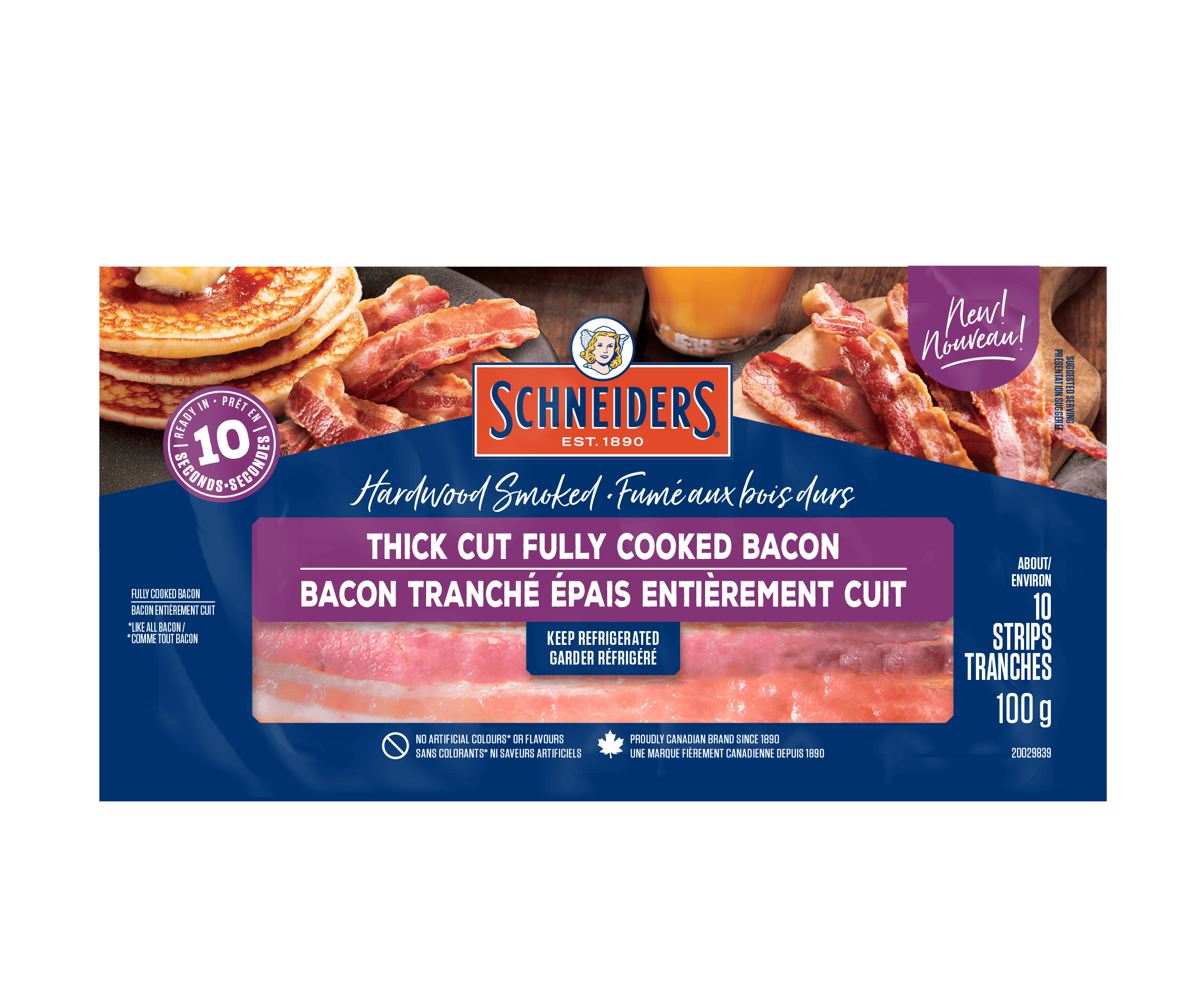 Looking for a quick way to enjoy the rich hardwood-smoked flavour of bacon without the prep? Our Thick Cut Fully Cooked Bacon goes from pack to plate in just 10 seconds, delivering the bold, smoky hardwood flavour you crave – without any artificial colours or flavours. Fit real bacon into your schedule – from busy mornings to quick dinners and everything in between!